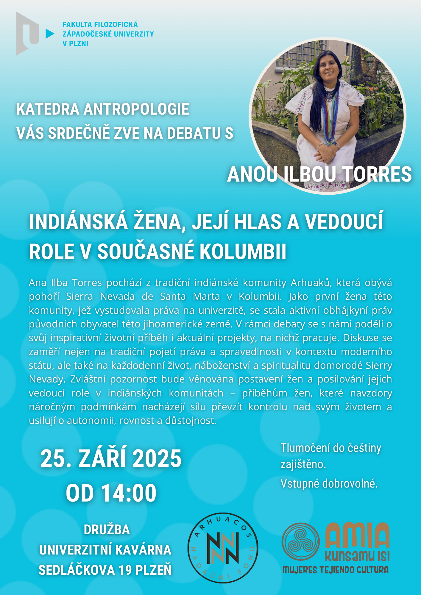 Ana Ilba Torres pochází z tradiční indiánské komunity Arhuaků v pohoří Sierra Nevada de Santa Marta v Kolumbii. Jako první žena své komunity vystudovala práva a dnes je aktivní obhájkyní práv původních obyvatel. Ve své práci propojuje otázky spravedlnosti, tradičního práva a spirituality s moderním kontextem života v Kolumbii. V debatě se s námi podělí o svůj životní příběh a projekty, na nichž aktuálně pracuje. Zvláštní pozornost bude věnována posilování postavení žen a jejich vedoucí role v domorodých komunitách – příběhům žen, které i v náročných podmínkách nacházejí sílu převzít kontrolu nad svým životem a usilují o autonomii, rovnost a důstojnost.